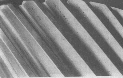 齒面上的小蝕坑很淺,一般起因于凹凸不平接觸。通常隨著點(diǎn)蝕的作用,凸出部分被消除后,齒面載荷便重新分布,點(diǎn)蝕不再進(jìn)一步發(fā)生(即點(diǎn)蝕受到抑制)。輪齒初期點(diǎn)蝕見(jiàn)于齒輪運(yùn)轉(zhuǎn)的初期階段,甚至在低于額定載荷下跑合后,早期也會(huì)出現(xiàn)。