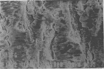 油膜相對(duì)于重載很薄的潤(rùn)滑條件下運(yùn)轉(zhuǎn)的齒輪副工作齒面的損傷。損傷面放大后可見(jiàn)密密麻麻成片的微小蝕微小裂紋。