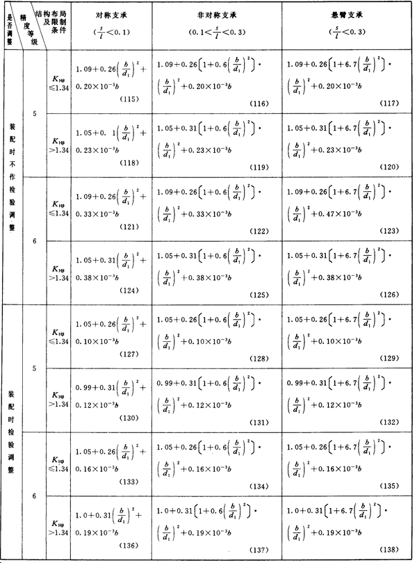 齒輪第Ⅲ公差組精度為5~8級(硬齒面為5~6級)及相應(yīng)的結(jié)構(gòu)布局限制條件的KHβ簡化計算公式見表14或表15。