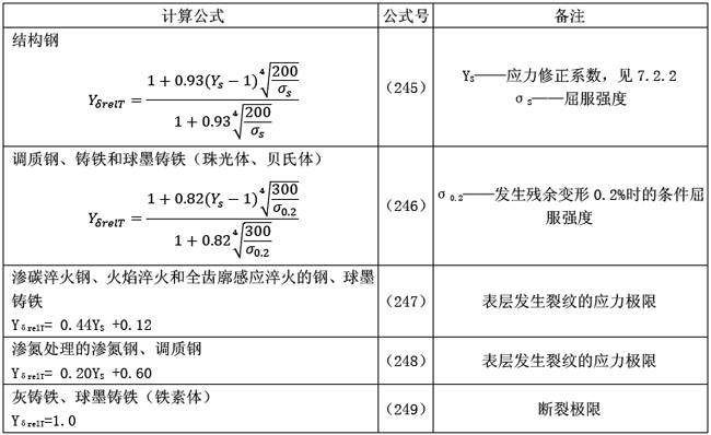 靜強(qiáng)度的YδrelT值可按表31中的相應(yīng)公式計算得出(當(dāng)應(yīng)力修正系數(shù)在1.5<YS<3的范圍內(nèi)時,靜強(qiáng)度的相對敏感系數(shù)YδrelT近似地可取為:YS/YST;但此近似數(shù)不能用于氮化的調(diào)質(zhì)鋼與灰鑄鐵)。