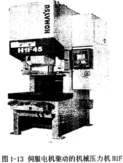 日本komatsu公司設(shè)計(jì)了一系列用伺服電機(jī)驅(qū)動(dòng)的機(jī)械壓力機(jī)H1F(見圖1-13)和H2F,并已推向市場(chǎng)。這一設(shè)計(jì)解廖了傳統(tǒng)機(jī)械壓力機(jī)不能控制的問題,壓力機(jī)可根據(jù)不同的生產(chǎn)需要設(shè)定不同的行程長(zhǎng)度和速度;通過伺服壓力機(jī)標(biāo)配的線性光柵尺,能夠始終保證下死點(diǎn)的成形精度,可達(dá)到微米級(jí),有效抑制了產(chǎn)品的毛刺及其他不合格品的出現(xiàn);可超低速運(yùn)行;模具振動(dòng)小,大大提高了模具的使用壽命;但造價(jià)昂貴,能耗也大。