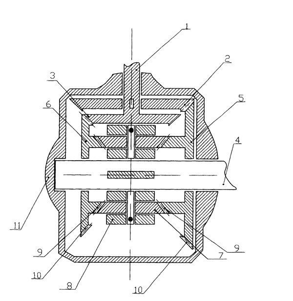 | 本發(fā)明涉及機(jī)械傳動(dòng)裝置,具體地說是以非等速運(yùn)動(dòng)的速度差完成力的傳遞,并具有大傳動(dòng)比的速差減速機(jī)。速差減速機(jī)設(shè)有相互垂直設(shè)置的主動(dòng)軸(1)和從動(dòng)軸(4)、第1主動(dòng)錐齒(2)和第2主動(dòng)錐齒(3),從動(dòng)軸(4)上滑動(dòng)套大雙錐齒滑動(dòng)齒輪(5)和小雙錐齒滑動(dòng)齒輪(6),大雙錐齒滑動(dòng)齒輪(5)和小雙錐齒滑動(dòng)的內(nèi)齒圈(9)之間設(shè)有行星齒輪(7)同時(shí)與兩側(cè)內(nèi)齒圈(9)嚙合,所述行星齒輪輪輻(8)與從動(dòng)軸(4)傳動(dòng)連接。由于兩個(gè)雙錐齒滑動(dòng)齒輪因不同徑而產(chǎn)生速度差,因而行星齒輪(7)同時(shí)受兩個(gè)雙錐齒滑動(dòng)齒輪異向驅(qū)動(dòng)力和速差平衡驅(qū)動(dòng)力的作用。通過調(diào)節(jié)兩個(gè)雙錐齒滑動(dòng)齒輪的直徑差,就可以得到所需的傳動(dòng)比,傳動(dòng)比可達(dá)數(shù)千至數(shù)萬。另外速差減速機(jī)的結(jié)構(gòu)非常簡潔、緊湊,因此,體積相對(duì)較小。 |