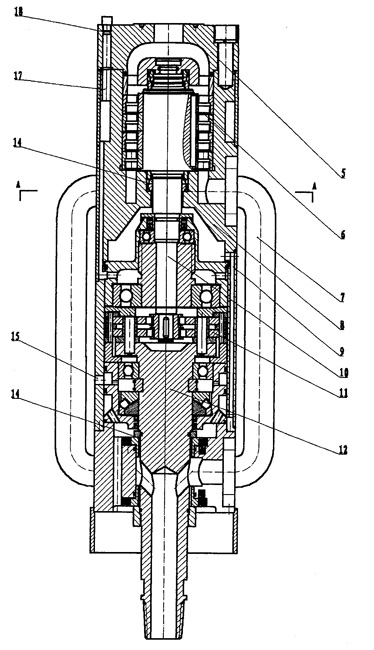| 一種旁流式水渦輪減速機(jī),其上部外接高壓水系統(tǒng),殼體內(nèi)上部的高壓腔內(nèi)設(shè)置渦輪(6),殼體下部的低壓腔內(nèi)設(shè)置減速機(jī)構(gòu)(11),其特征是:設(shè)置高壓水導(dǎo)流管(7),導(dǎo)流管(7)上端連通在渦輪下部,下端連通輸出軸(12)的出水口。 |