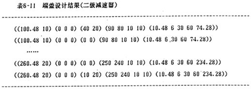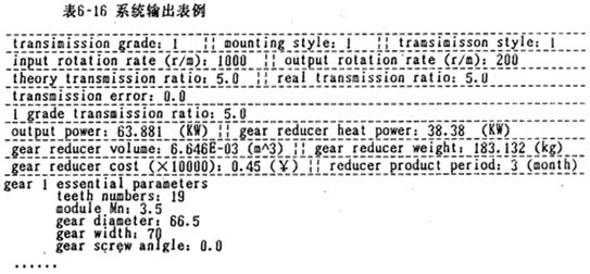 圓柱齒輪減速器設(shè)計完成后,其結(jié)果為一系列表(LISP 語言形式)組成的結(jié)果。為了使專家系統(tǒng)的結(jié)果方便地被用戶所理解,系統(tǒng)設(shè)置有相應(yīng)的輸出函數(shù),并以表格的形式,輸出所需的設(shè)計數(shù)據(jù)。下表(表6-16 )為專家系統(tǒng)設(shè)計的一一級圓柱齒輪減速器的示例。
