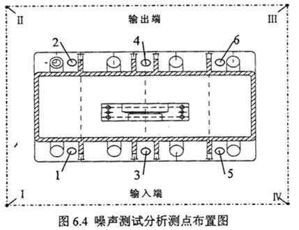 結(jié)構(gòu)振動(dòng)噪聲測(cè)試在齒輪箱安裝基腳布置6個(gè)測(cè)點(diǎn),測(cè)點(diǎn)布置圖見(jiàn)圖3中1-6測(cè)點(diǎn),在每一測(cè)點(diǎn)上按31.5Hz~5kHz1/3倍頻中心頻率測(cè)試加速度級(jí)頻譜(re:a0=10-6m/s)和1/3倍頻中心頻率測(cè)試速度級(jí)頻譜(re:a0=5*10-8m/s)?諝庠肼暅y(cè)試聲壓級(jí)基準(zhǔn)2*10-5Pa,用聲級(jí)計(jì)上的A計(jì)權(quán)聲壓級(jí)和1/1倍頻程聲壓級(jí)測(cè)量減速齒輪裝置各個(gè)測(cè)點(diǎn)。各測(cè)點(diǎn)距齒箱測(cè)量表面的距離為1米。測(cè)點(diǎn)位置見(jiàn)測(cè)點(diǎn)布置圖6.4中Ⅰ-Ⅳ測(cè)點(diǎn)。