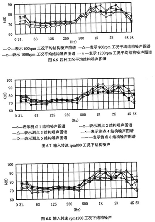 (5)從圖6.9空氣噪聲倍頻程圖譜可以看出,隨著轉(zhuǎn)速升高在小于1000Hz時(shí)空氣噪聲倍頻程幅值變化不大,但大于1000Hz至5000Hz時(shí)變化較明顯,這與減速器的嚙合頻率或嚙合頻率倍數(shù)成份上的振動(dòng)幅值較大有很大關(guān)系。