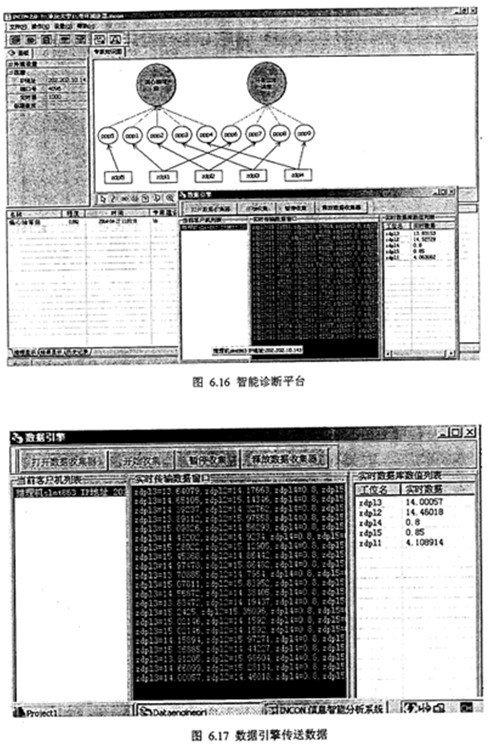 綜上分析,采用人機(jī)交互方式將Zdp14、Zdp15等參數(shù)輸入計(jì)算機(jī),智能診斷系統(tǒng)得到雙環(huán)減速器故障診斷結(jié)果,偏心軸彎曲故障,程度值在0~1范圍變化,齒形誤差較大。智能診斷結(jié)果如圖6.15所示。圖6.16是智能診斷平臺(tái)進(jìn)行現(xiàn)場(chǎng)一線(xiàn)診斷分析,圖6.17是數(shù)據(jù)引擎進(jìn)行實(shí)時(shí)數(shù)據(jù)接收和數(shù)據(jù)發(fā)送。