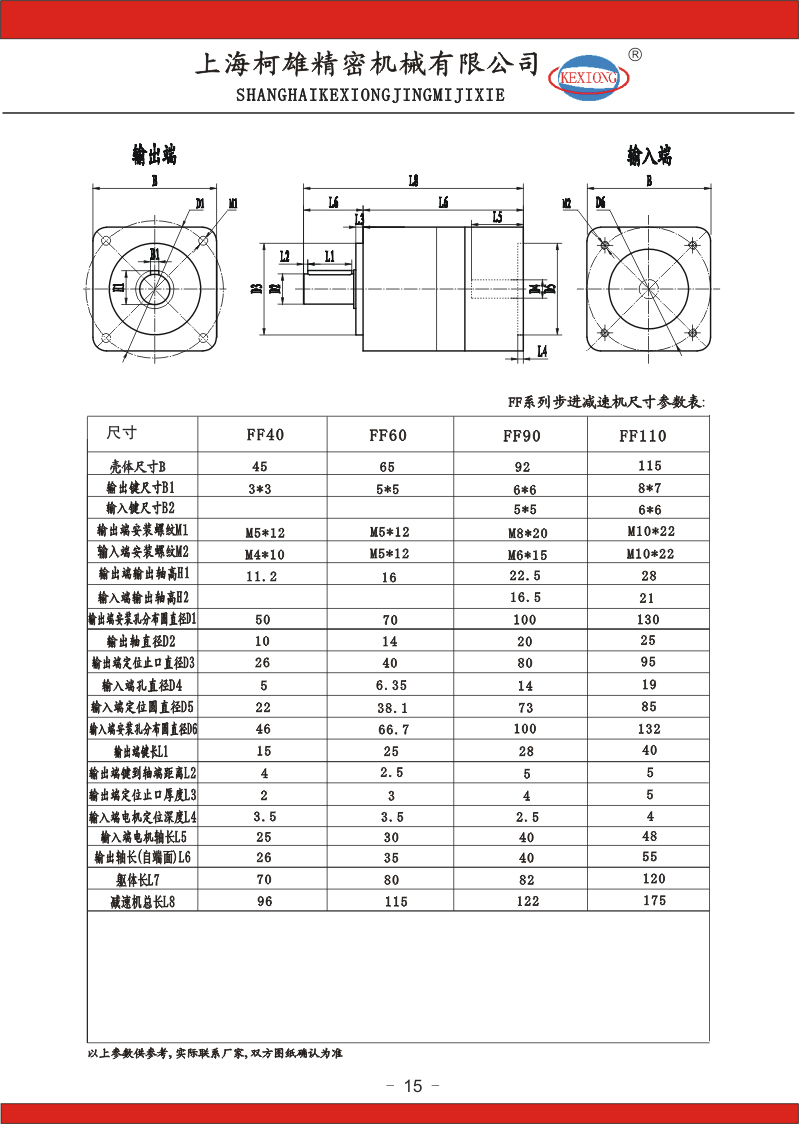 FF系列步進電機減速機:FF40、FF60、FF90、FF110、同軸式機座型號,速比:3-1000有20多個比速可選擇;分一、二、三級減速傳動;精度:一級傳動精度在8-10弧分,二級傳動精度在6-8弧分,三級傳動精度7-10弧分;等一千多種規(guī)格。