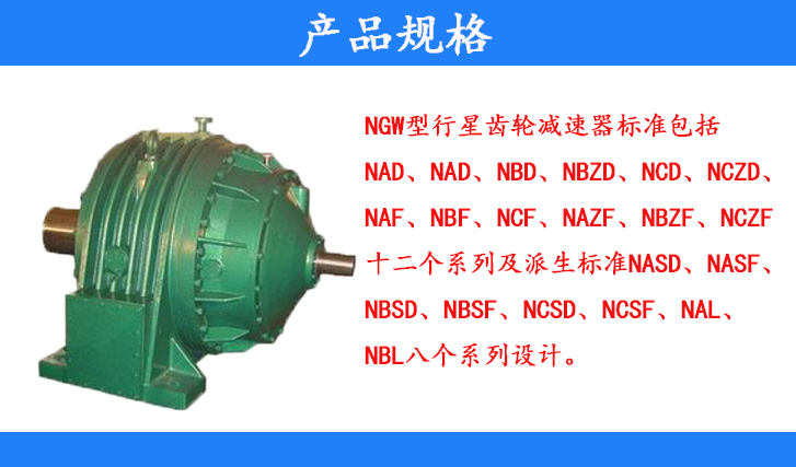 NGW型行星齒輪減速器標準包括NAD、NAD、NBD、NBZD、NCD、NCZD、NAF、NBF、NCF、NAZF、NBZF、NCZF十二個系列及派生標準NASD、NASF、NBSD、NBSF、NCSD、NCSF、NAL、NBL八個系列設計。