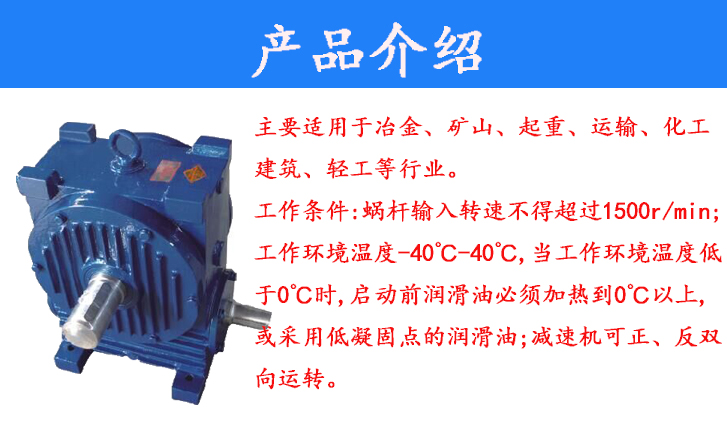 主要適用于冶金、礦山、起重、運(yùn)輸、化工建筑、輕工等行業(yè)。工作條件:蝸桿輸入轉(zhuǎn)速不得超過(guò)1500r/min;工作環(huán)境溫度-40℃-40℃,當(dāng)工作環(huán)境溫度低于0℃時(shí),啟動(dòng)前潤(rùn)滑油必須加熱到0℃以上,或采用低凝固點(diǎn)的潤(rùn)滑油;減速機(jī)可正、反雙向運(yùn)轉(zhuǎn)。