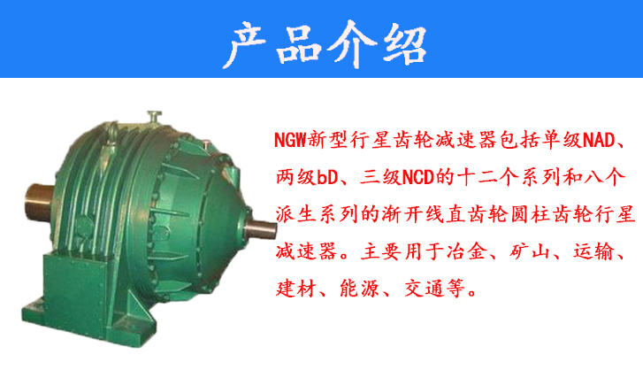 NGW新型行星齒輪減速器包括單級(jí)NAD、兩級(jí)bD、三級(jí)NCD的十二個(gè)系列和八個(gè)派生系列的漸開(kāi)線直齒輪圓柱齒輪行星減速器。主要用于冶金、礦山、運(yùn)輸、建材、能源、交通等。