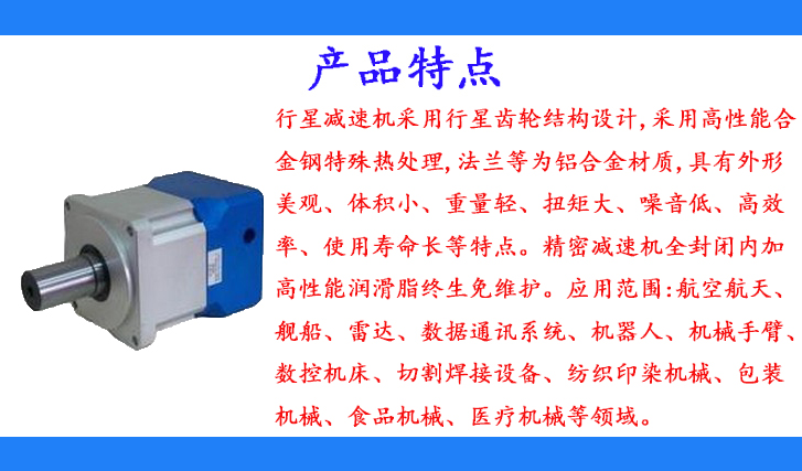 行星減速機(jī)采用行星齒輪結(jié)構(gòu)設(shè)計(jì),采用高性能合金鋼特殊熱處理,法蘭等為鋁合金材質(zhì),具有外形美觀、體積小、重量輕、扭矩大、噪音低、高效率、使用壽命長(zhǎng)等特點(diǎn)。精密減速機(jī)全封閉內(nèi)加高性能潤(rùn)滑脂終生免維護(hù)。