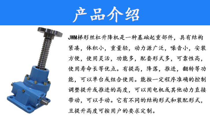 JWM梯形絲杠升降機是一種基礎(chǔ)起重部件,具有結(jié)構(gòu)緊湊、體積小、重量輕、動力源廣泛、無噪音、安裝方便、使用靈活、功能多、配套形式多、可靠性高、使用壽命長等許多優(yōu)點?梢詥闻_或組合使用,能按一定程序準確地控制調(diào)整提升或推進的高度,也可以用電動機或其它動力直接帶動,也可以手動。它有不同的結(jié)構(gòu)形式和裝配形式,且提升高度可按用戶的要求定制。