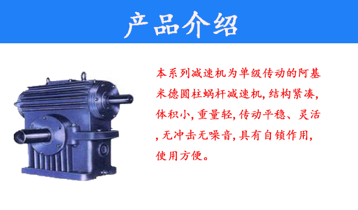 本系列減速機(jī)為單級傳動(dòng)的阿基米德圓柱蝸桿減速機(jī),結(jié)構(gòu)緊湊,體積小,重量輕,傳動(dòng)平穩(wěn)、靈活,無沖擊無噪音,具有自鎖作用,使用方便。