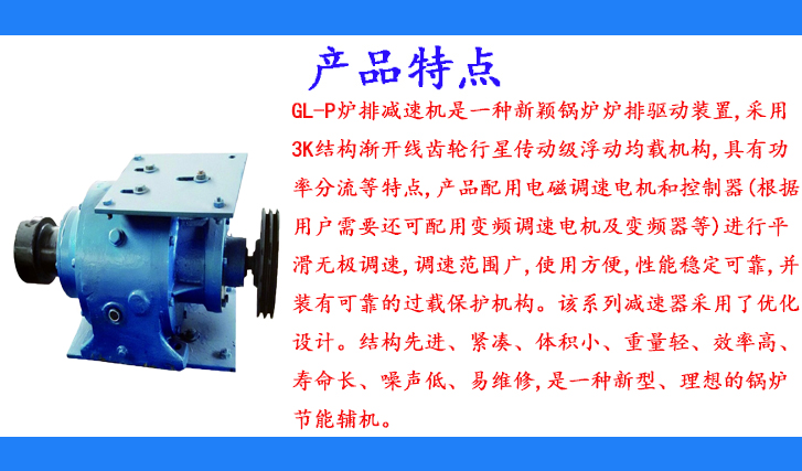 GL-P爐排專用減速機(jī)結(jié)構(gòu)先進(jìn)、緊湊、體積小重量輕、效率高、壽命長、噪聲低、易維修,是一種新型、理想的鍋爐輔機(jī)。