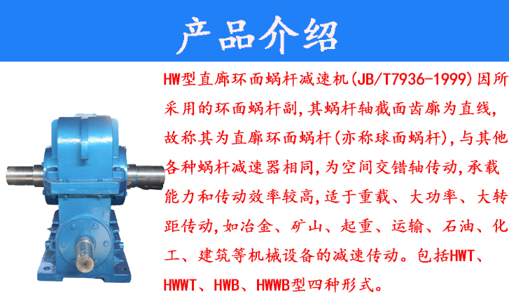 HW型直廊環(huán)面蝸桿減速機(jī)(JB/T7936-1999)因所采用的環(huán)面蝸桿副,其蝸桿軸截面齒廓為直線(xiàn),故稱(chēng)其為直廓環(huán)面蝸桿(亦稱(chēng)球面蝸桿),與其他各種蝸桿減速器相同,為空間交錯(cuò)軸傳動(dòng),承載能力和傳動(dòng)效率較高,適用于重載、大功率、大轉(zhuǎn)距傳動(dòng),如冶金、礦山、起重、運(yùn)輸、石油、化工、建筑等機(jī)械設(shè)備的減速傳動(dòng)。包括HWT、HWWT、HWB、HWWB型四種形式。