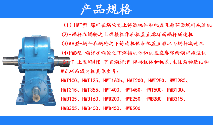HW直廓環(huán)面減速機(jī)具體型號(hào):HWT100、HWT125、HWT160、HWT200、HWT250、HWT280、HWT315、HWT355、HWT400、HWT450、HWT500