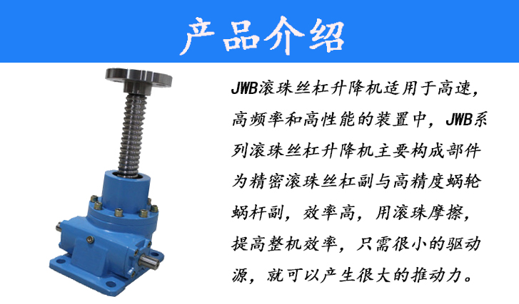 JWB滾珠絲杠升降機適用于高速、高頻率和高性能的裝置中,JWB系列滾珠絲杠升降機主要構(gòu)成部件為精密滾珠絲杠副與高精度度蝸輪蝸桿副,效率高,用滾珠摩擦,提高整機效率,只需很小的驅(qū)動源,就可以產(chǎn)生很大的推動力。
