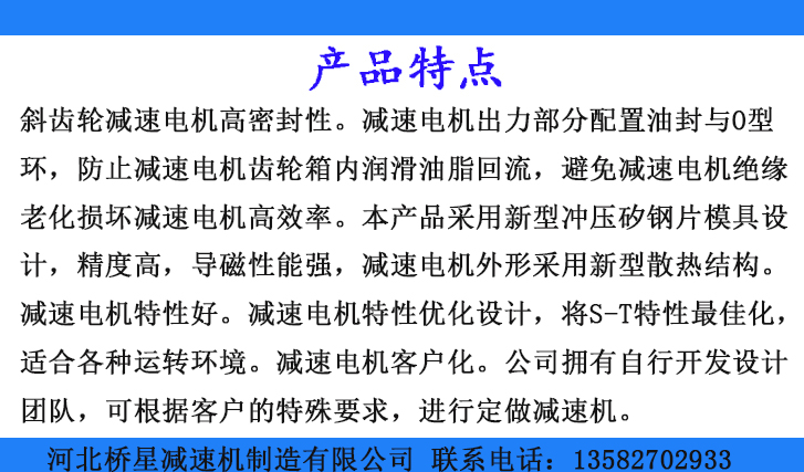 2、減速電機高效率。本產(chǎn)品采用新型沖壓的鋼片模具設計,精度高,導磁性能強,減速電機外形采用新型散熱結構。