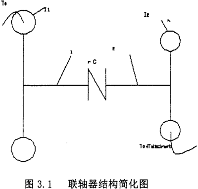 為了便于求解運(yùn)動(dòng)微分方程,需要對(duì)傳動(dòng)軸系中聯(lián)軸器的主動(dòng)和從動(dòng)兩側(cè)的轉(zhuǎn)動(dòng)慣量和剛度作力學(xué)模型的簡(jiǎn)化。根據(jù)具體結(jié)構(gòu)情況,可以將軸系簡(jiǎn)化為若干個(gè)等效轉(zhuǎn)動(dòng)慣量圓盤,以具有某一剛度的周聯(lián)系起來(lái)。通常比較典型的是簡(jiǎn)化為兩個(gè)等效的圓盤,配置在聯(lián)軸器的兩側(cè)。并設(shè)定所聯(lián)兩軸的剛性很大,只有聯(lián)軸器具有彈性和阻尼。如圖3.1所示