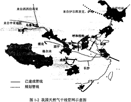 我國十至十五年內(nèi)天然氣管網(wǎng)建設(shè)的總體規(guī)劃可以概括為“兩橫兩縱”:“兩橫”分別指立足于國內(nèi)資源的輪南~上海西氣東輸干線,以及為從西部其他國家引進(jìn)天然氣建設(shè)的第二條新疆~上海輸氣干線:“兩縱”是指從俄羅斯進(jìn)口天然氣,分別建設(shè)東西伯利亞經(jīng)東北至北京,以及薩哈林至沈陽輸氣干線,具體線路走向如圖1-2所示。