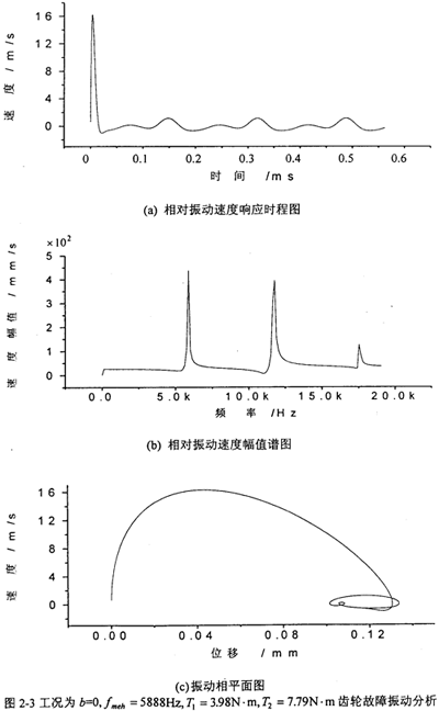 的計(jì)算結(jié)果,圖2-3~圖2-13為各種工況的齒輪故障振動(dòng)分析,其中包括齒輪輪齒相對(duì)振動(dòng)速度時(shí)程響應(yīng)圖、齒輪輪齒相對(duì)振動(dòng)速度幅值譜圖和相平面圖。