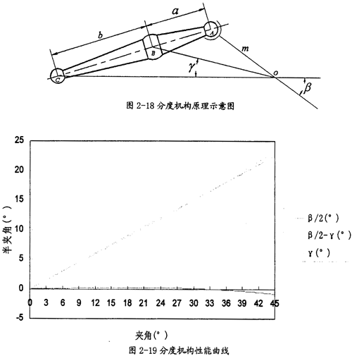 現(xiàn)作出分度機構(gòu)中理論半偏轉(zhuǎn)角,實際半偏轉(zhuǎn)角γ和它們的差的函數(shù)圖形,如圖2-19所示。