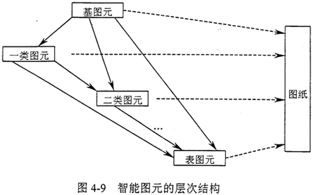 可繼承性:一個(gè)智能圖元不僅可以是其他智能圖元的父圖元,也可以是一個(gè)或多個(gè)智能圖元的子圖元,最底層的智能圖元稱為基圖元,他們沒有父圖元;最上層的智能圖元稱為表圖元,他們沒有子圖元,其集成度最高;就象一個(gè)機(jī)器的裝配圖由若干個(gè)零件圖組成,而一個(gè)零件圖是由若干個(gè)結(jié)構(gòu)單元組成,整個(gè)智能圖元集合屬于一種比較復(fù)雜的層次結(jié)構(gòu),如圖4-9。