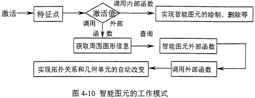 通過對(duì)特征點(diǎn)的激活,首先判斷激活值,是調(diào)用外部函數(shù)還是調(diào)用內(nèi)部函數(shù),如果是調(diào)用內(nèi)部函數(shù),則根據(jù)激活值,調(diào)用某個(gè)內(nèi)部函數(shù),實(shí)現(xiàn)智能圖元自身的操作,如刪除、放大、旋轉(zhuǎn)等等;如果是調(diào)用外部函數(shù),則再獲取周圍圖元信息,并以此查詢外部函數(shù)庫(kù),得到某個(gè)外部函數(shù),則調(diào)用此外部函數(shù),實(shí)現(xiàn)智能圖元的拓?fù)潢P(guān)系和幾何單元信息的改變。(如圖4-11所示)