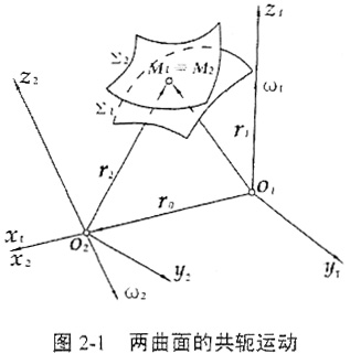 如圖2-1Σ1、Σ2為兩共軛的任意曲面,其中Σ1設(shè)為母曲前,S1(o1x1y1z1)、S2(o2x2y2z2)為兩個(gè)分別與Σ1、Σ2相固連的坐標(biāo)系,r1(1)、r2(2)分別表示Σ1、Σ2上一點(diǎn)的位置矢,N1(1)、N2(2)分別表示曲向Σ1、Σ2上r1(1)、r2(2)兩點(diǎn)處的單位法矢。上述符號中上標(biāo)表示所定義的坐標(biāo),下標(biāo)表示所屬的曲面。