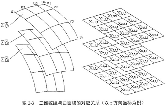 若已知曲面Σ1由一系列離散的坐標(biāo)值表示,則規(guī)則化后的坐標(biāo)值系列可以寫成二維數(shù)組成的形式,二維數(shù)組中的各維分別對應(yīng)u,v參變量或方向,二維數(shù)組中的各元素分別對應(yīng)曲面上節(jié)點(diǎn)的坐標(biāo);那么,曲面Σ1在坐標(biāo)S2中運(yùn)動(dòng)形成的曲面族{Σ1}可以用三維數(shù)組表示,三維數(shù)組的各維分別對應(yīng)u,v,t參變量或方向,并且曲面族中的各點(diǎn)與此三維數(shù)組的各個(gè)元素在空間結(jié)構(gòu)上是——對應(yīng)的,如圖2-3所示。