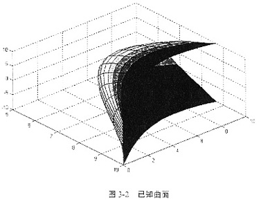 式(3-1)中第一式表示曲面Σ1由坐標(biāo)系S1變換到坐標(biāo)系S2所形成的曲面族,Xmatrix,Ymatrix,Zmatrix分別表示曲面族中各點(diǎn)在x,y,z坐標(biāo)方向上的坐標(biāo)值;第二式中的,NXt,NYt,NZt表示曲面Σ1在點(diǎn)(u,v)對(duì)應(yīng)于t的相對(duì)法矢分量,DXt,DYt,DZt表示點(diǎn)(u,v)運(yùn)動(dòng)軌跡對(duì)應(yīng)于t的相對(duì)切矢分量。