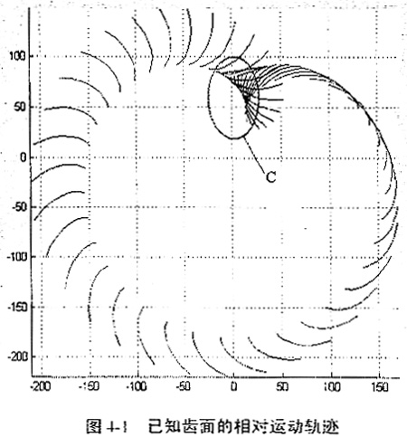 在已知齒輪齒面一個(gè)周期的相對(duì)運(yùn)動(dòng)所留下的運(yùn)動(dòng)軌跡中,我們可以看出,在區(qū)域C中出現(xiàn)了一個(gè)清晰的包絡(luò)面,它就是所求的未知齒面,即兩齒面在C區(qū)嚙合,稱C區(qū)為嚙合區(qū),而在C區(qū)之外,也會(huì)出現(xiàn)包絡(luò),但那只是幾何意義上的共軛點(diǎn),不產(chǎn)生真正意義上的嚙合傳動(dòng);已知齒面在嚙合區(qū)域與非嚙合區(qū)域有較清晰的界限;在嚙合區(qū)域,已知曲面與所求齒面的共軛關(guān)系是簡(jiǎn)單的,無(wú)論是否會(huì)出現(xiàn)二次接觸,這一區(qū)域的共軛曲面都可以用數(shù)字化共軛曲面求解方法求出。
