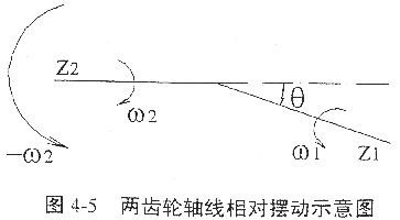 設(shè)兩齒輪的軸線分別為z1,z2,與之固連的坐標(biāo)系分別為S1,S2,轉(zhuǎn)動(dòng)角速度分別為ω1,ω2,兩軸線交角為θ,F(xiàn)暫不考慮兩齒輪的嚙合運(yùn)動(dòng),只考察兩齒輪的相對(duì)擺動(dòng),為使z2固定不動(dòng),可假設(shè)給系統(tǒng)添加一個(gè)繞z2軸且與ω2大小相同、方向相反的運(yùn)動(dòng),如圖4-5所示。則與齒輪固連的坐標(biāo)系S1相對(duì)于S2的運(yùn)動(dòng)可以描述為繞z1軸的自轉(zhuǎn)與繞z2軸的公轉(zhuǎn)。