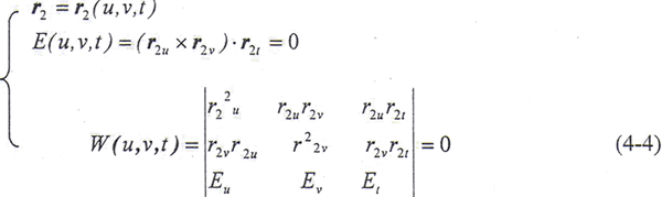 為了使上述向量方程變?yōu)闃?biāo)量方程,使等式兩端點(diǎn)積以r2u×r2v(≠0),并按拉格朗日恒等式展開,整理后得