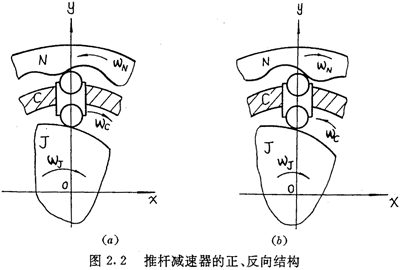 在推桿減速器中,設(shè)激波器按順時(shí)針方向旋轉(zhuǎn),則傳動圈C,內(nèi)齒圈N的轉(zhuǎn)向可能與激波器相同,也可能相反(圖2.2)。為了研究問題的方便,本文中稱傳動圈與主動件激波器轉(zhuǎn)向相同的結(jié)構(gòu)為正向結(jié)構(gòu)(圖2.2(a)),稱傳動圈與激波器轉(zhuǎn)向相反的結(jié)構(gòu)為反向結(jié)構(gòu)(圖2.2(b))。