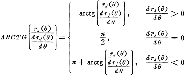 上式中的μ為曲線HJ在M1點(diǎn)的向徑與切線正方向的夾角。前面已說過,曲線向徑與切線正向的夾角μ的取值范圍是[O,π]。在用計(jì)算機(jī)解算時(shí),反正切函數(shù)arctg(x)的值域是,所以為了使概念明確和使用方便,特定義下面在本文中使用的函數(shù):