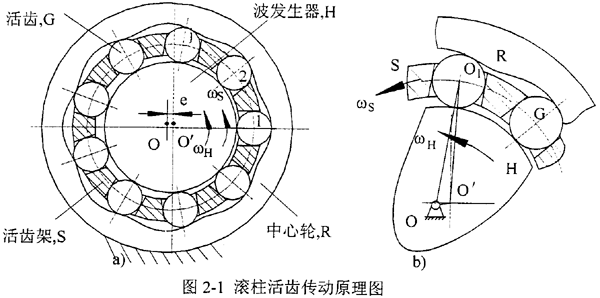 滾柱活齒傳動(dòng)系統(tǒng)(見圖2-la)主要由波發(fā)生器H、活齒G、活齒架S、中心輪R四個(gè)部分組成。如圖2-lb所示,滾柱活齒傳動(dòng)系統(tǒng)在工作時(shí),輸入驅(qū)動(dòng)力后,輸入軸以等角速度ωH,逆時(shí)針旋轉(zhuǎn),從而帶動(dòng)波發(fā)生器使其幾何中心O′繞旋轉(zhuǎn)中心O以同樣角速度旋轉(zhuǎn),波發(fā)生器半徑變化的輪廓曲線產(chǎn)生徑向推力,迫使與中心輪工作齒廓接觸的諸活齒,在沿活齒架徑向?qū)Р垡苿?dòng)的同時(shí),沿著中心輪工作齒廓滑滾,并通過活齒架的徑向?qū)Р弁苿?dòng)活齒架以勻速ωS逆時(shí)針轉(zhuǎn)動(dòng),于是滾柱活齒傳動(dòng)完成了輸入速度ωH、輸出速度ωS的轉(zhuǎn)速變換運(yùn)動(dòng)。而與中心輪非工作齒廓接觸的諸滾柱活齒,在活齒架徑向?qū)Р弁苿?dòng)下,順序地返回到導(dǎo)槽內(nèi)工作起始位置,從而分別完成了各自的運(yùn)動(dòng)循環(huán)。