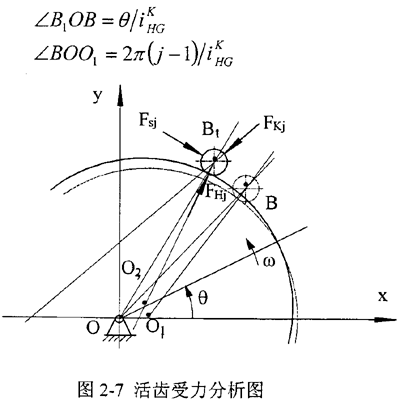 固定中心輪R,不失一般性,選擇活齒數(shù)ZG與中心輪齒數(shù)ZR之差為1。此時(shí)傳動(dòng)比大小等于活齒個(gè)數(shù)。假設(shè)開始時(shí),波發(fā)生器的幾何中心O1在X軸上,該活齒中心在B點(diǎn),波發(fā)生器以角速度ω逆時(shí)針轉(zhuǎn)動(dòng)。t時(shí)刻時(shí),波發(fā)生器轉(zhuǎn)過θ角,該活齒中心運(yùn)動(dòng)到Bl點(diǎn),波發(fā)生器的幾何中心從Ol運(yùn)動(dòng)到O2;Fsj、FHj、FKj分別為活齒架、波發(fā)生器、中心輪對(duì)該滾柱活齒的法向壓力。