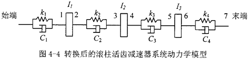 根據(jù)上述方法,可以初步建立起如圖4-3所示的系統(tǒng)動(dòng)力學(xué)模型,為了能夠利用傳遞矩陣法對(duì)該系統(tǒng)進(jìn)行動(dòng)力學(xué)分析,需將各慣性元件和彈性元件向輸入軸轉(zhuǎn)換(也可向輸出軸或中間任一軸轉(zhuǎn)換,均不影響結(jié)果),構(gòu)成單一軸線的當(dāng)量圓盤系統(tǒng)的扭振動(dòng)力學(xué)模型。轉(zhuǎn)換中,按轉(zhuǎn)換前后系統(tǒng)的動(dòng)能和勢(shì)能保持不變的原則,確定轉(zhuǎn)換后動(dòng)力學(xué)模型中各元件的參數(shù)。