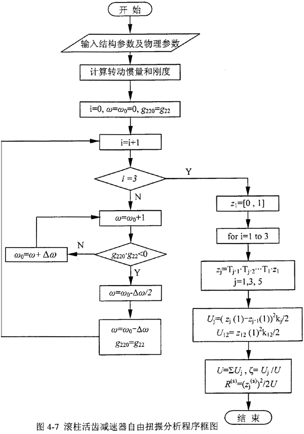 根據(jù)前面介紹的方法,在計算機(jī)上編程對減速器的扭振動力學(xué)特性進(jìn)行分析,其程序框圖見圖4-7所示。在計算機(jī)上運算時,按照確定的頻率步長對頻率方程掃頻,作出“G11-ω”曲線,如圖4-8所示,凡G22=0時的ω值,就是系統(tǒng)的固有頻率。有關(guān)固有頻率、勢能分布率和模態(tài)柔度的計算結(jié)果見表4-2。另外,利用該程序還繪制出圖4-9所示的減速器系統(tǒng)的振型曲線。