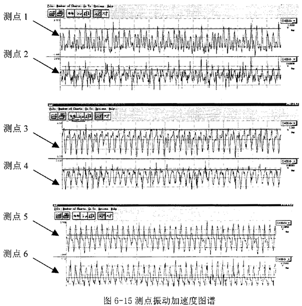 由表6-1可看出,在轉速恒定時,隨著負載的增加,各個測點的振動基本呈減小趨勢,這符合一般減速器的振動規(guī)律。另外,各測點的最大加速度值較低,表明整個減速器的振動水平較低,也證明了慣性力和慣性力矩基本達到了平衡,與設計相符合。