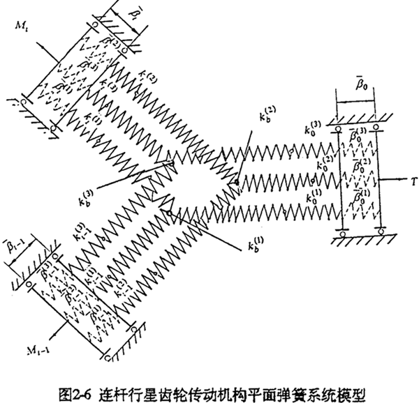 國(guó)科2-3所示為一多相并列連桿行星齒輪過(guò)約束機(jī)構(gòu)。為了得到與靜不定次數(shù)相對(duì)應(yīng)的S個(gè)補(bǔ)充方程,必考慮各構(gòu)件間、各相機(jī)構(gòu)間、以及多齒承載的位移協(xié)調(diào)要求,這是分析具有多余聯(lián)系體系受力的一般方法。為此,可先將機(jī)構(gòu)轉(zhuǎn)化為受力、變形等效的結(jié)構(gòu)(幾何不變體系),然后用結(jié)構(gòu)力學(xué)的方法分析系統(tǒng)、構(gòu)件位移協(xié)調(diào)的條件。