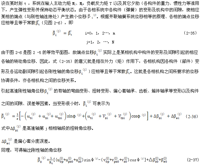對(duì)于連桿行星齒輪傳動(dòng)機(jī)構(gòu)來(lái)說(shuō),為了克服機(jī)構(gòu)“死點(diǎn)”,一般是采用多相并列雙曲柄平行四邊形機(jī)構(gòu)或多曲柄平行四邊形機(jī)構(gòu)作為輸入機(jī)構(gòu)的。因此,它是多次靜不定的過(guò)約束機(jī)構(gòu)。要完全確定機(jī)構(gòu)的約束動(dòng)反力,必須尋求與其靜不定次數(shù)相同數(shù)目的位移協(xié)調(diào)補(bǔ)棄方程。過(guò)約束機(jī)構(gòu)的靜不定次數(shù)與運(yùn)動(dòng)構(gòu)件數(shù),運(yùn)動(dòng)副類型及其數(shù)量等有關(guān)。對(duì)于少齒差連桿行星齒輪傳動(dòng)機(jī)構(gòu),由于接觸承載輪齒對(duì)數(shù)因與載荷 大小,機(jī)構(gòu)的運(yùn)轉(zhuǎn)工況角的周期函數(shù)。因此,城要增加的機(jī)構(gòu)位移協(xié)調(diào)方程也是工況角的函數(shù)。