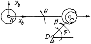 上式中,(xb,yb)是B處的位移量,θ為連桿繞鉸點的轉(zhuǎn)角位移,β為接觸點C在從動曲柄軸上繞軸線(D)的轉(zhuǎn)角位移,L為連桿的長度,見圖3.2。