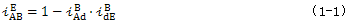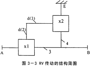 為計算RV傳動的傳動比,將上述的傳動簡圖用圖3-3所示的結(jié)構(gòu)簡圖代替。該機(jī)構(gòu)簡圖包括兩個簡單行星機(jī)構(gòu):x1和x2。輸出件A為中心輪1,輸出件B為輸出盤6,且有ω64。支承件E為針輪7,漸開線行星輪2與轉(zhuǎn)臂(曲柄軸)3均為輔助件d。