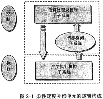 柔性速度補(bǔ)償單元由兩部分組成,包括機(jī)械運(yùn)動子系統(tǒng)、信息處理及控制子系統(tǒng),其中后者又包括信息處理與控制、傳感檢測兩部分。其邏輯組成如圖2-l所示。