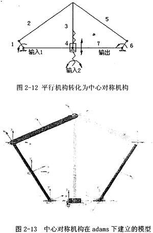 這種平行桿機(jī)構(gòu)理論上正確,但是實(shí)際上運(yùn)行時會產(chǎn)生奇異,不能實(shí)際采用,因此轉(zhuǎn)化為如圖2-12所示的這種中心對稱的連桿機(jī)構(gòu)。并在adams軟件下建立了模型如圖2-13,經(jīng)分析認(rèn)為該機(jī)構(gòu)完全對稱的結(jié)構(gòu)特征,更適合于一般情況下的速度等速傳遞,不適合在沖壓工況下應(yīng)用,所以這種結(jié)構(gòu)也決定不采用。