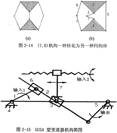 方案三:在眾多已有機(jī)構(gòu)類型篩選當(dāng)中,發(fā)現(xiàn)機(jī)構(gòu)式脈動無級變速器中的一種:三相并列連桿式(GUSA)脈動無級變速器采用的機(jī)構(gòu)可以供鑒。這咱變速器設(shè)計(jì)原理為:采用三相并列結(jié)構(gòu),作為輸入機(jī)構(gòu)的是相位差為120度的三曲拐曲軸,每個曲拐帶動一套Ⅲ級七桿機(jī)構(gòu),如圖所示是(7,8)圖譜中(1)的一種同構(gòu)機(jī)構(gòu),圖2-14顯示了它的轉(zhuǎn)化和各桿件的標(biāo)號,可以與圖2-15結(jié)構(gòu)簡圖——對應(yīng)。