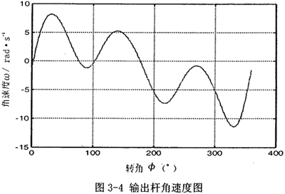 第二種情況 第一輸入速度和第一種情況的速度值相同,現(xiàn)第二輸入經(jīng)螺旋機構(gòu)轉(zhuǎn)化為往復運動后,輸入速度為v=sinθ1(θ1為第一輸入角位移),即為滑塊3的速度,再編程計算,得出結(jié)果如圖3-4,圖3-5所示。